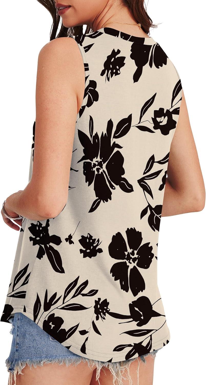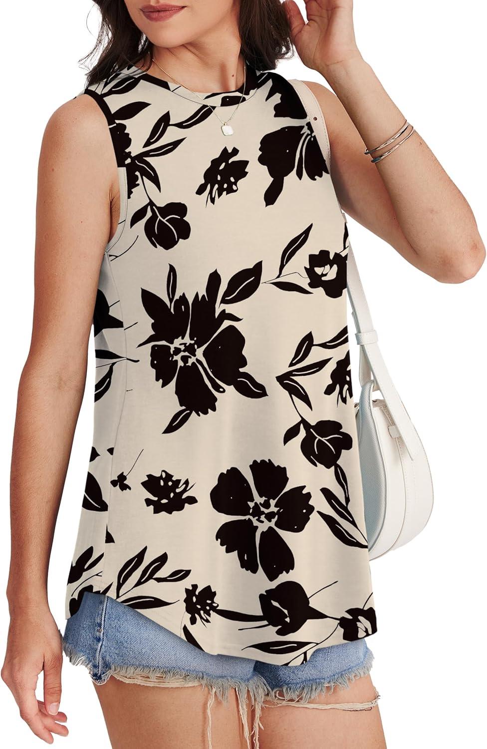OFEEFAN High Neck Tank Tops for Women Loose Fit Sleeveless Top Summer Clothes Womens Tunic Tops to Wear with Leggings(Q-beige Black Floral)