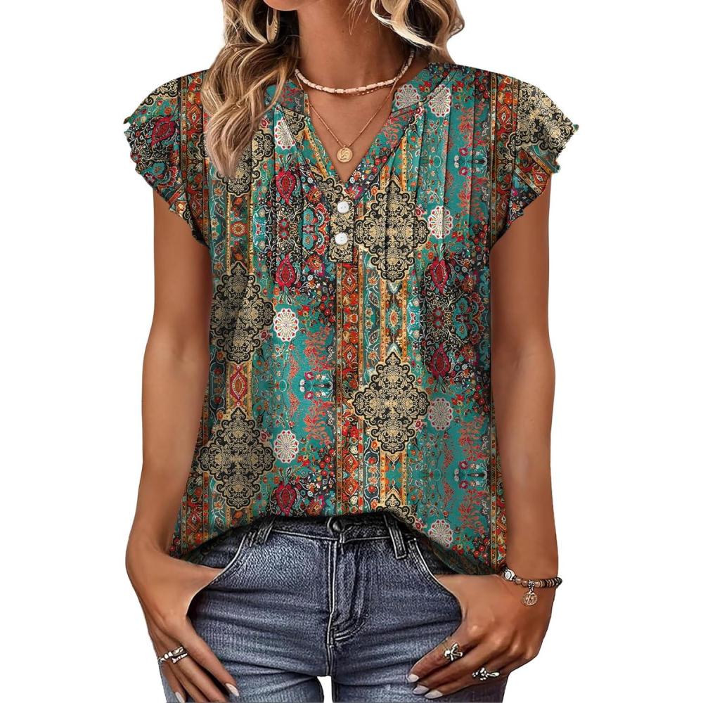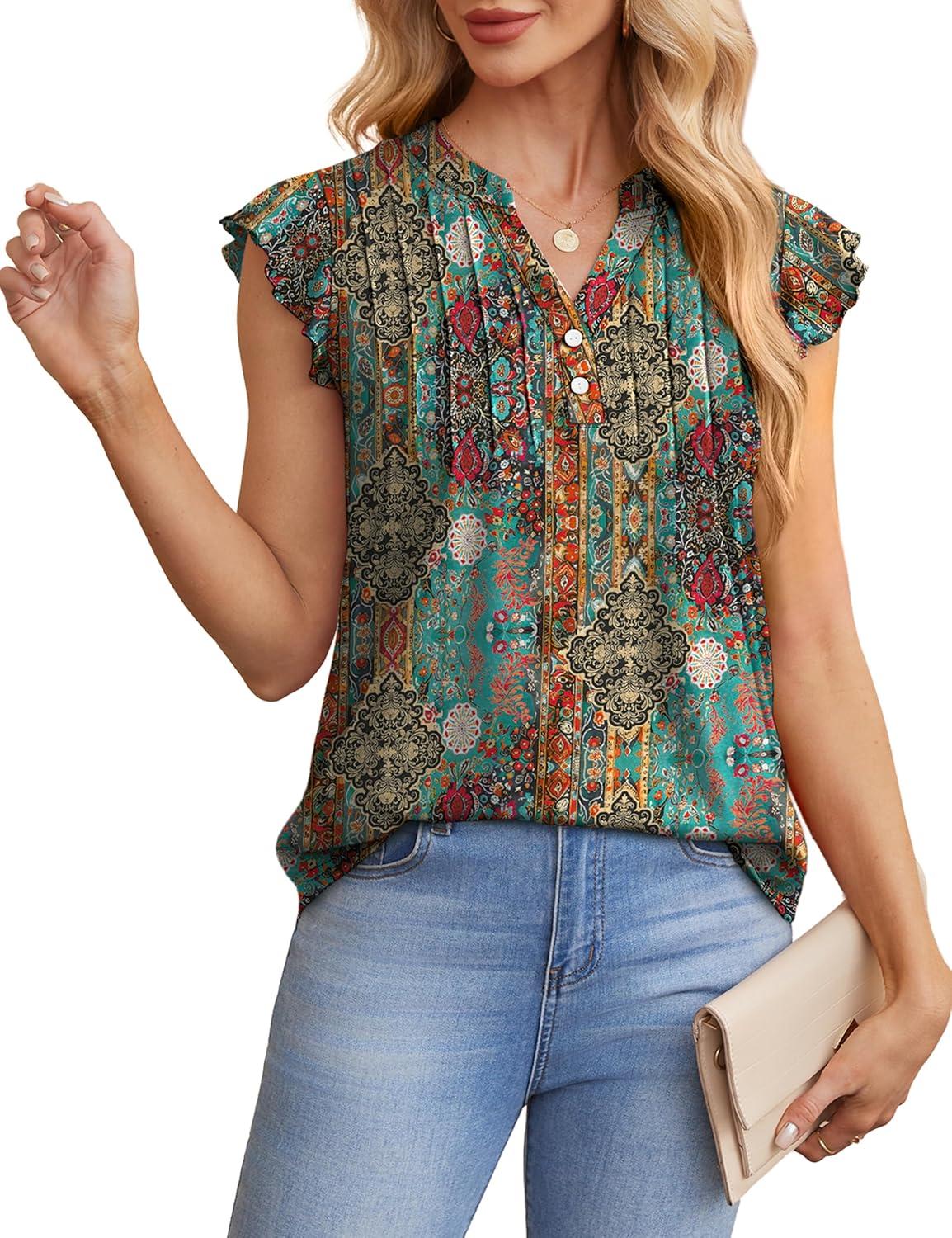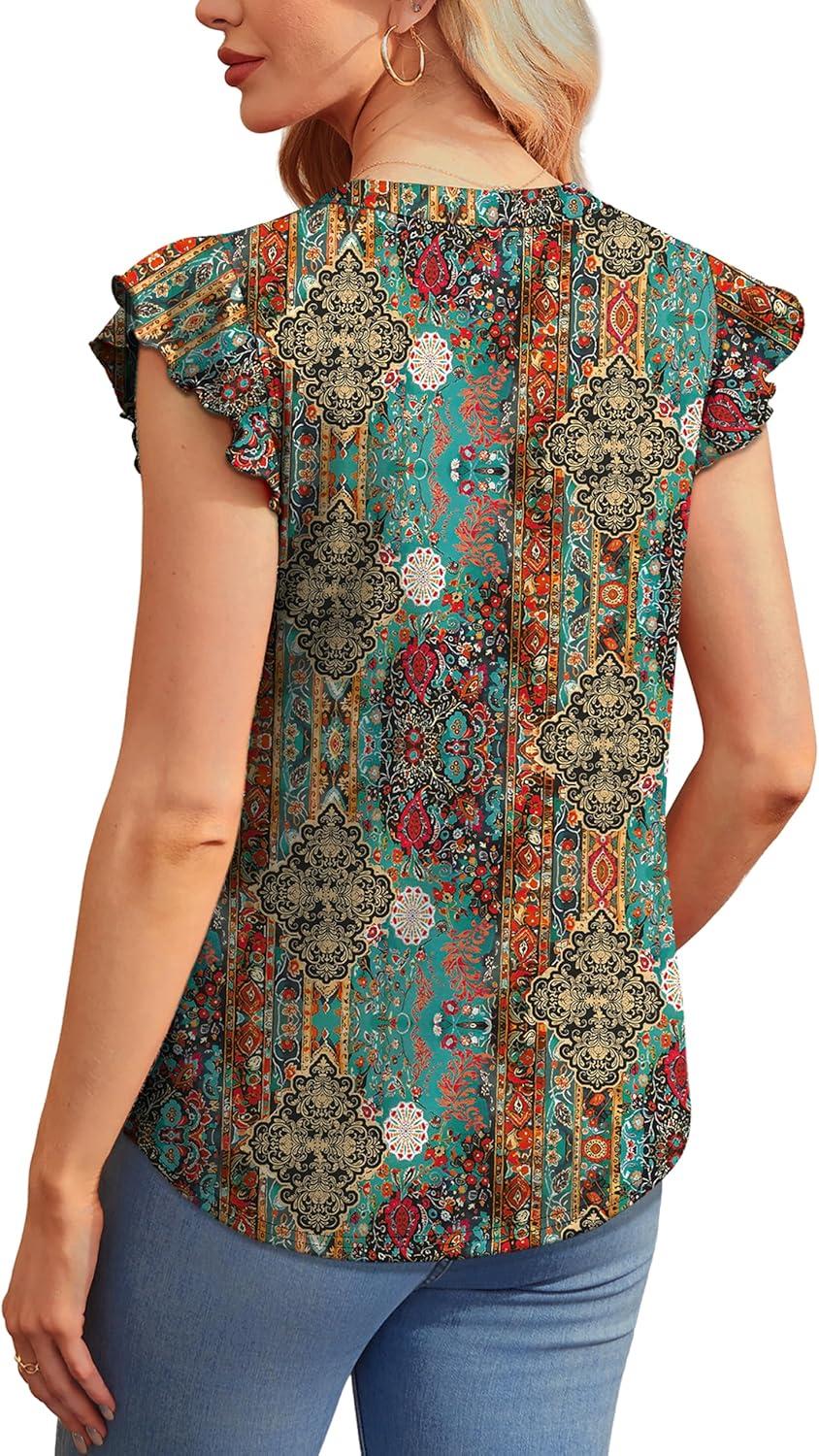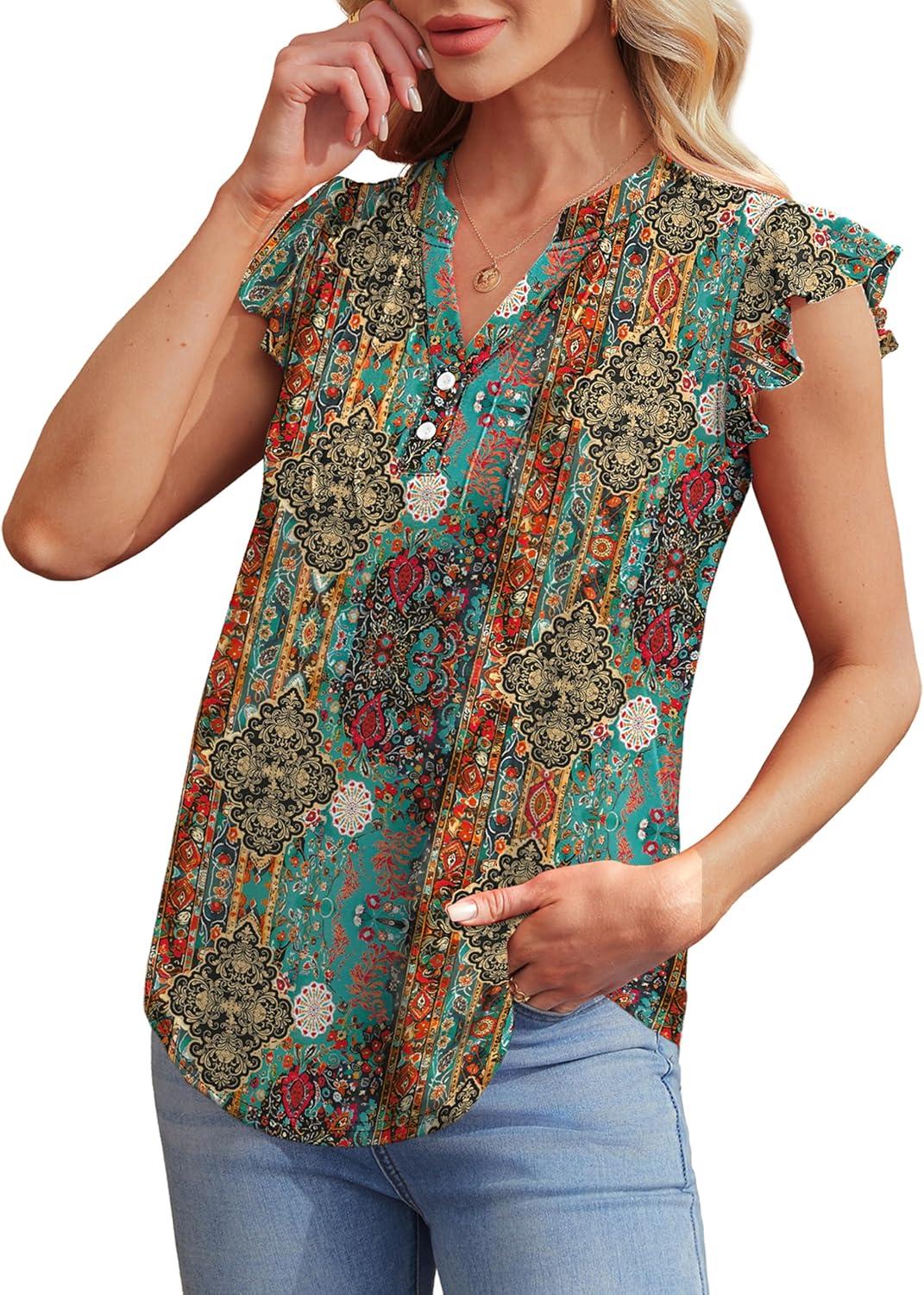 OFEEFAN Summer Tops for Women Button Down Blouses for Women Dressy Casual V Neck T Shirts Ruffle Sleeve(B Colorful Boho)